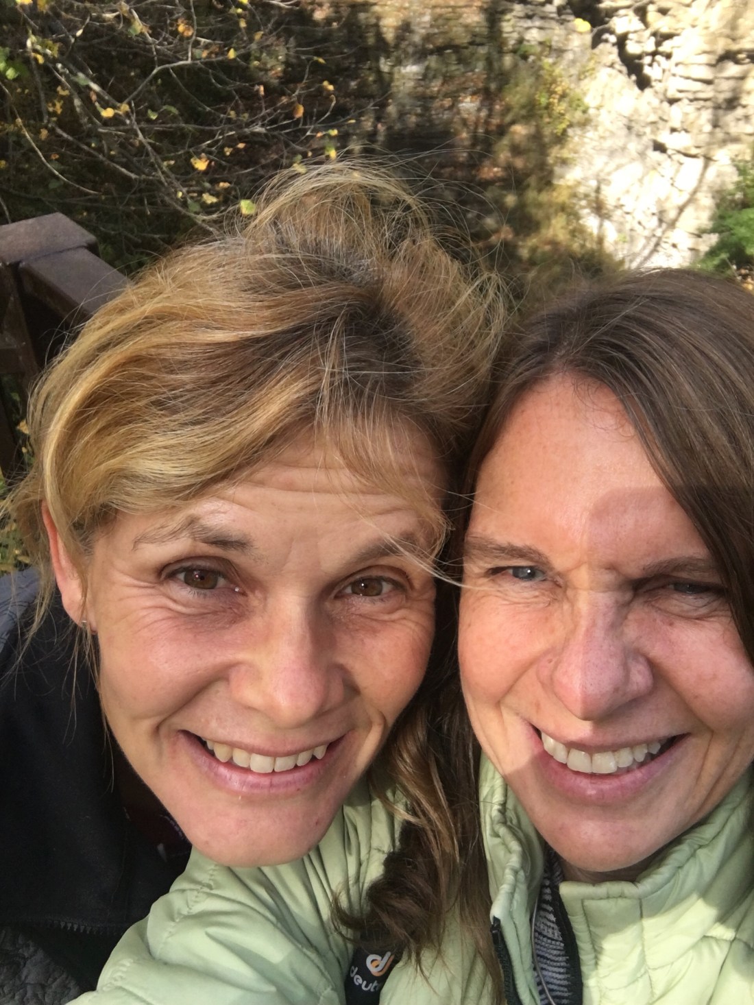 So “selfies” – THE thing to do – however talking a good selfie seems to be a huge challenge for Kim and me. Perhaps because at over 50 we just don’t look as good as we used to? Go ahead and laugh younger generation. Here we are capturing a moment in front of Swayze Falls – one of several… Where are the falls? Impossible.