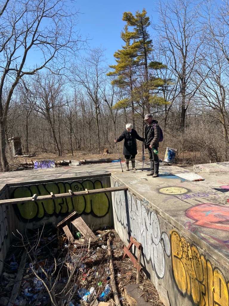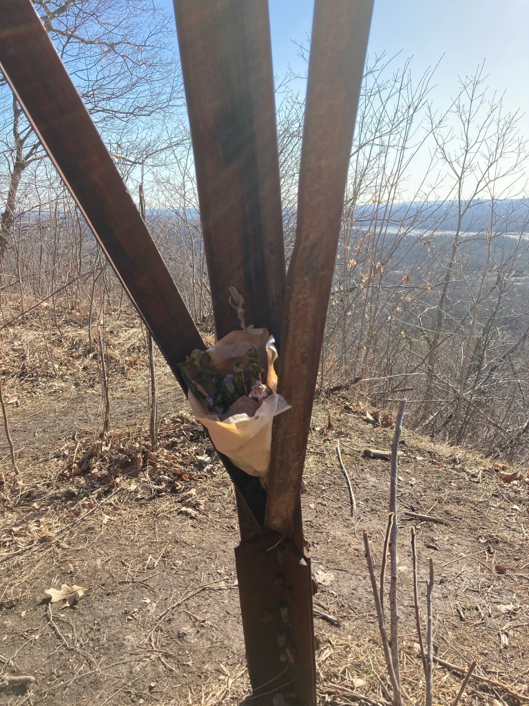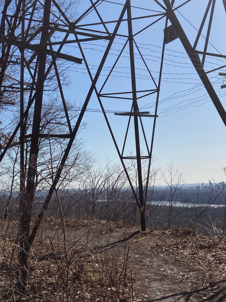 From Romar Drive, the Bruce Trail follows the crest of the Escarpment east into Rock Chapel Nature Sanctuary, part of the Royal Botanical Gardens. We came upon a hydro tower built at the cliff edge. It was draped in barbed wire and dried flowers were tucked in a corner. Kirkby told a story of a youth who had died climbing the tower – “A guy died here climbing this thing”. His stories of the past had been so prolific that day, I assumed he meant many years ago. However, when fact checking for this blog, I learned that a young man was electrocuted here while climbing the tower only weeks previously. I still don’t know if Kirkby’s story is one and the same or if there has been more than one tragedy here.