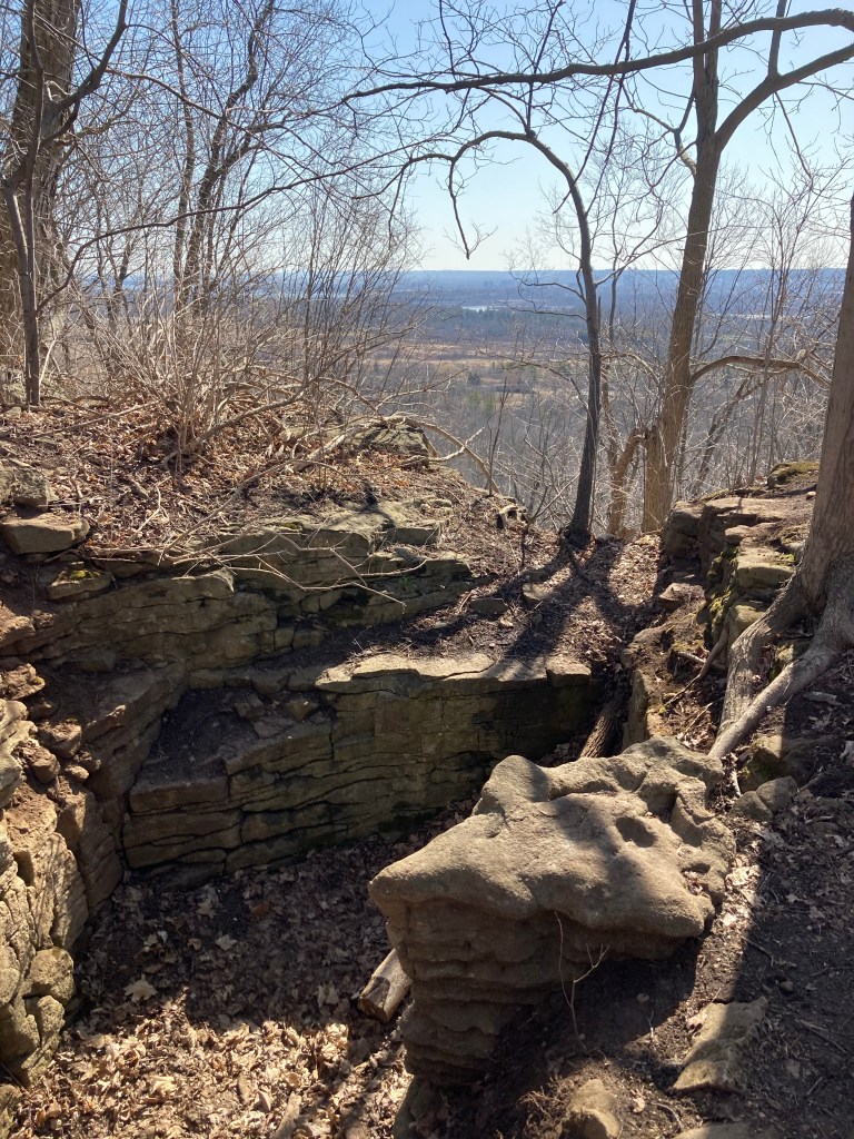 The trail left Sydenham Road and headed east just under the crest of the Escarpment. Here are two pictures – one faces north with the rocky ledge framing my hiking companions and in the second, I am facing south with a view overlooking the Dundas Valley, Hamilton Harbour and the steel mills. Such contrasting views depending on which way you look!