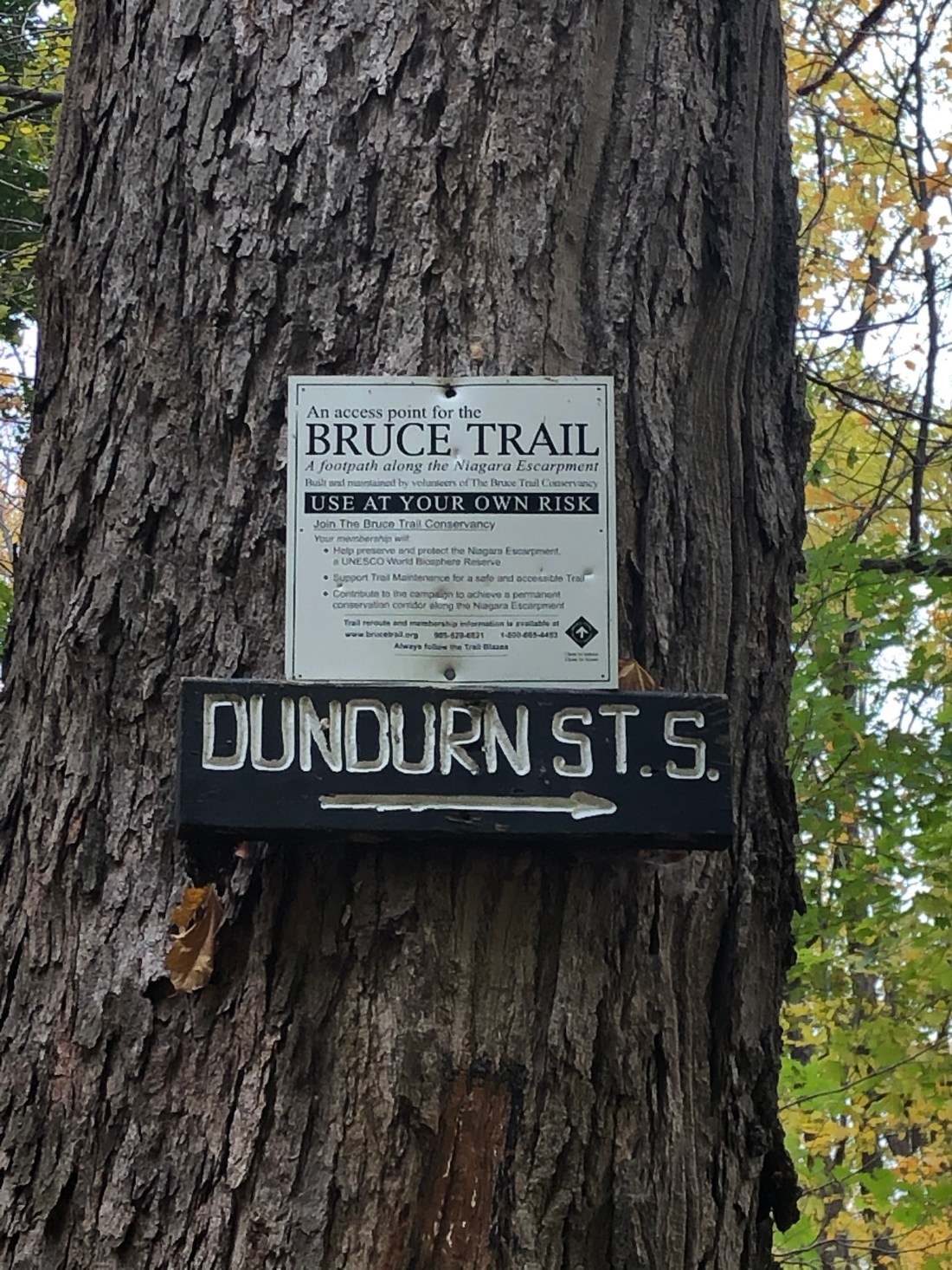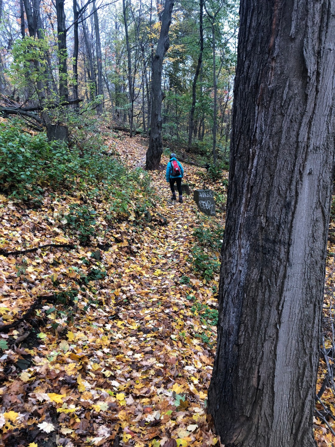 This day was a different hike. It was 11.1km entirely within the city of Hamilton. From the East End to the West End, the Bruce Trail quietly passes through this large city which sits on top of the Escarpment, locally known as “The Mountain”, and continues over its edge down to the shore of Lake Ontario and Hamilton Harbour. In all the time that I have spent in this city, and the years that Kim and I spent at high school on the edge of the “mountain brow”, I had never before noticed a Bruce Trail marker. And yet today, they became plainly obvious as they guided us through so many familiar places where we had been before.