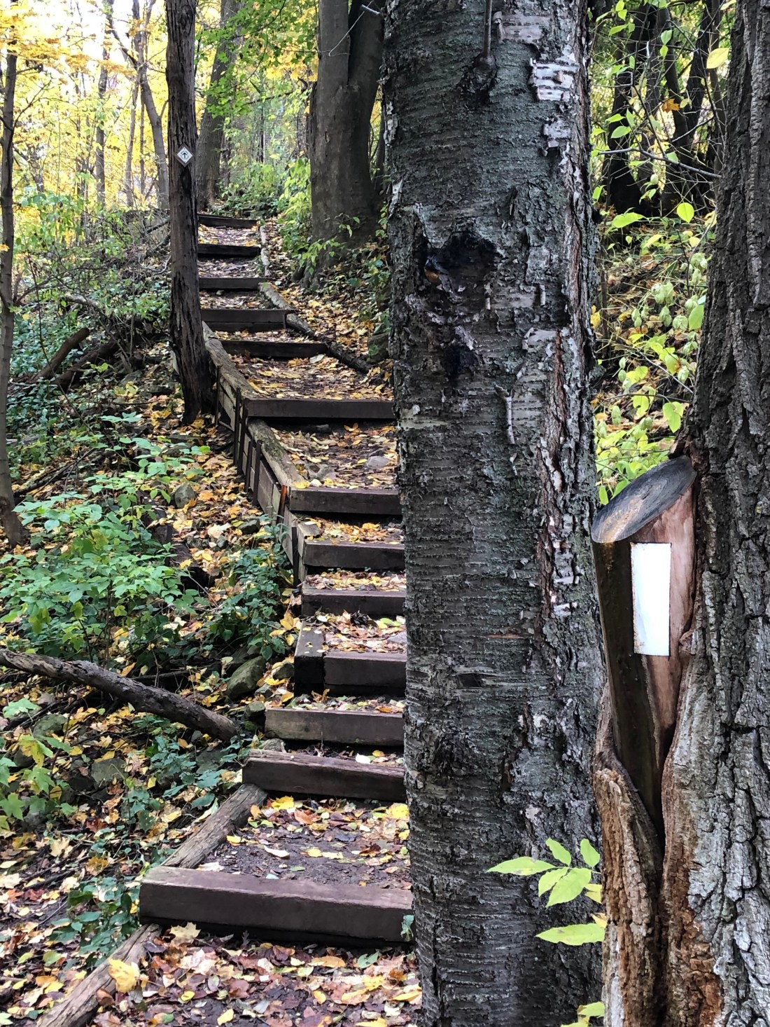 The trail led us up the Wentworth stairs. This is the most used Escarpment staircase in Hamilton. It has 498 steps, although we just went up the lower half. We braced ourselves for the climb! Note the Bruce Trail marker high up on the pole.